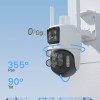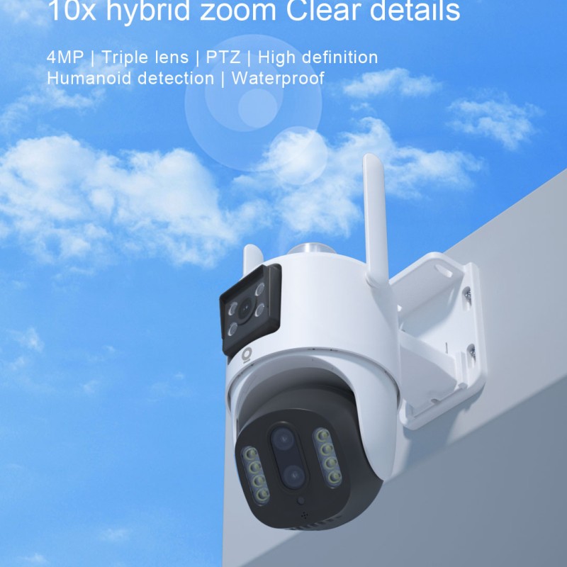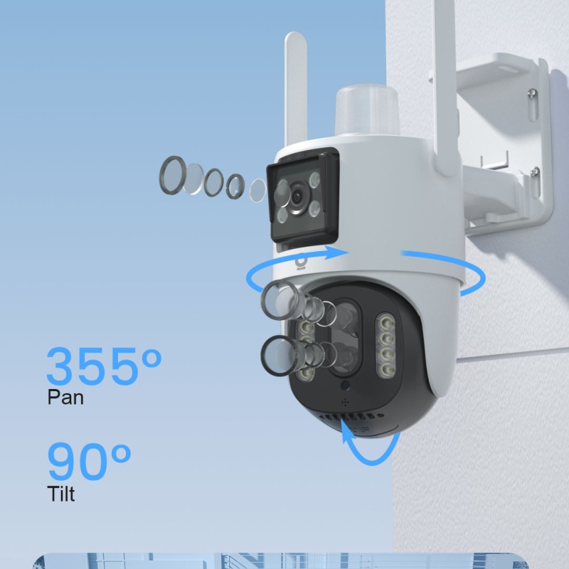 The device supports PTZ pan-tilt control with 355° horizontal rotation and 90° vertical pitch, providing almost 360° coverage of the surveillance area. Combined with a three-lens hybrid zoom system (two 4.0mm wide-angle lenses + 8.0mm telephoto lens), it enables flexible switching between long-range and close-up views, allowing for both overall control and magnification of key details.